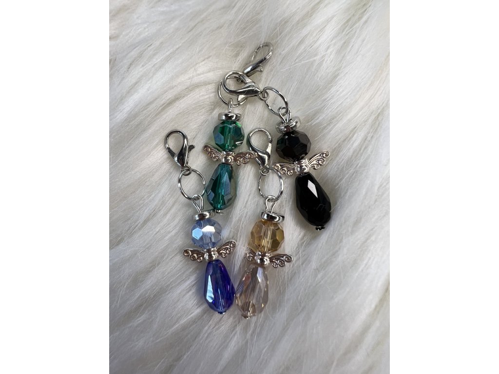 Andílek z fazetovaných korálků jako talisman na karabince.